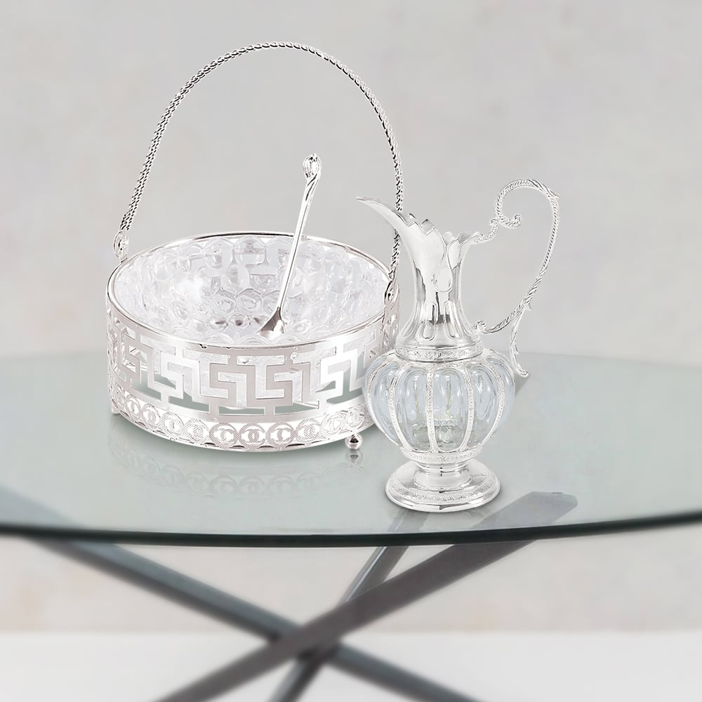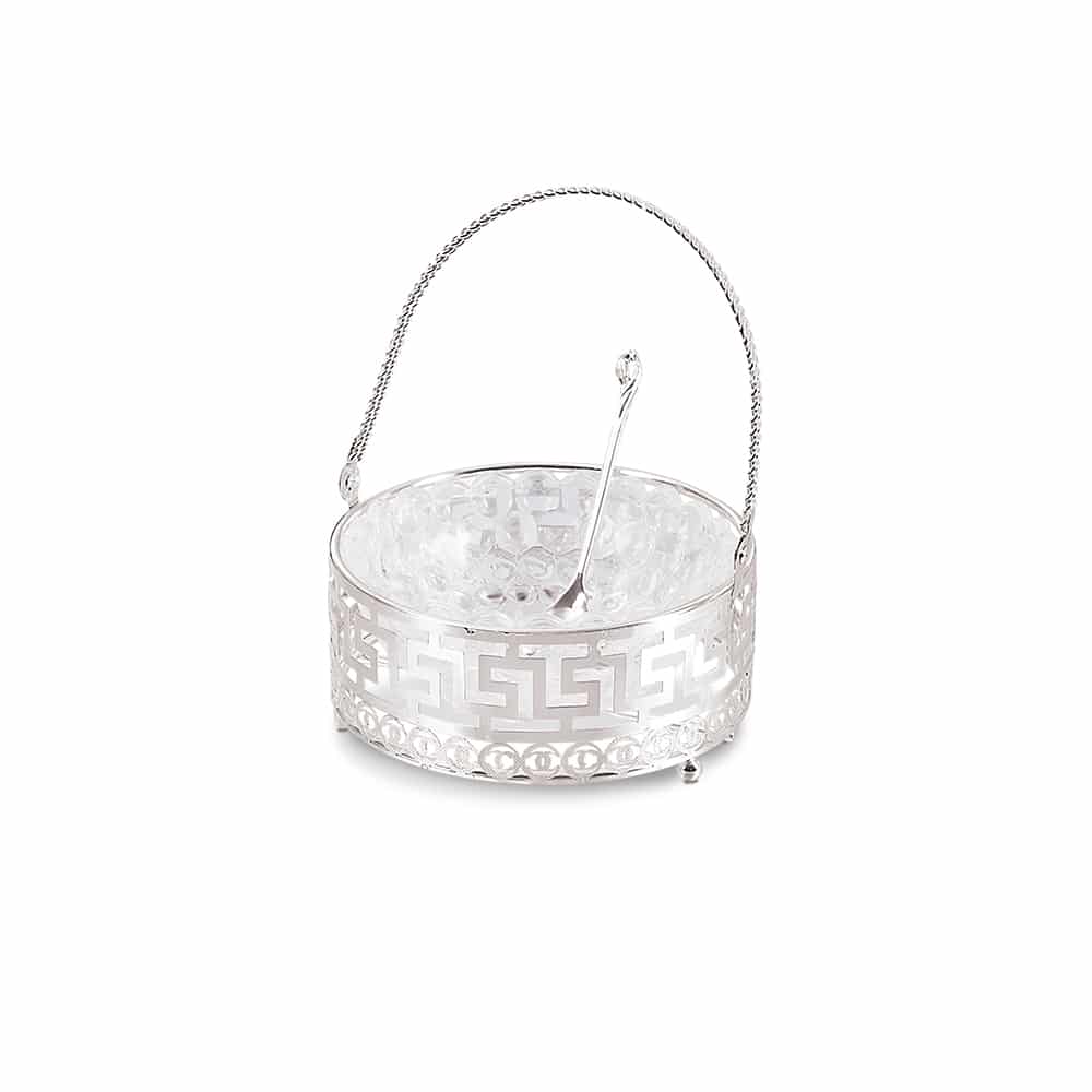 A beautiful fruit & flower V design Basket with detailed borders and minute finishing can be used for keeping fruits & veggies or bread and toast with an unmistakable elegance. Featuring the signature piece of excellence, this handled silver serving tray has lavishly embossed border with designed handle.