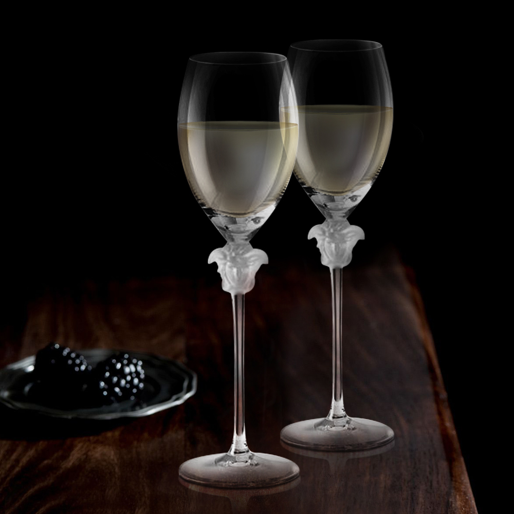 Crystal white wine glass set embellished by a Medusa that appears to be “locked” under two layers of crystal – alluding to the Gorgon’s petrifying gaze. Every piece is individually cut, milled and polished from the block of solid glass. The hand-made articles differ from those produced industrially because no two pieces are ever exactly the same. Every piece is unique, the proof and mark of the craftsmanship involved in production