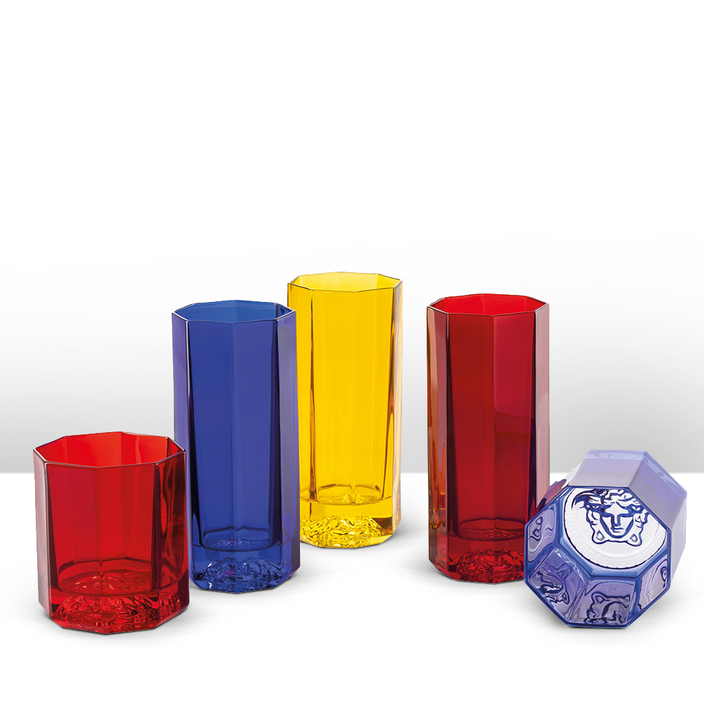 Crystal whisky glass set embellished by a Medusa that appears to be “locked” under two layers of crystal – alluding to the Gorgon’s petrifying gaze. Every piece is individually cut, milled and polished from the block of solid glass. The hand-made articles differ from those produced industrially because no two pieces are ever exactly the same. Every piece is unique, with small variations (such as tiny bubbles or slight differences in weight) the proof and mark of the craftsmanship involved in production